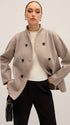 Kurtka o prostym kroju łączy w sobie elegancję i nowoczesność, idealnie wpisując się w sezonowe trendy. Jej długość sięga do bioder, co sprawia, że jest uniwersalnym wyborem na różne okazje. Dwurzędowe zapięcie na guziki dodaje klasycznego charakteru, jednocześnie zapewniając wygodę użytkowania. Stójka zamiast tradycyjnego kołnierza nadaje całości subtelnej oryginalności i nowoczesnego wyglądu. Rękawy o pełnej długości są lekko luźne, co pozwala na swobodę ruchu i komfort noszenia. Ta kurtka doskonale sprawdzi się zarówno w codziennych stylizacjach, jak i podczas bardziej formalnych wyjść.