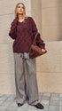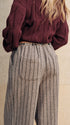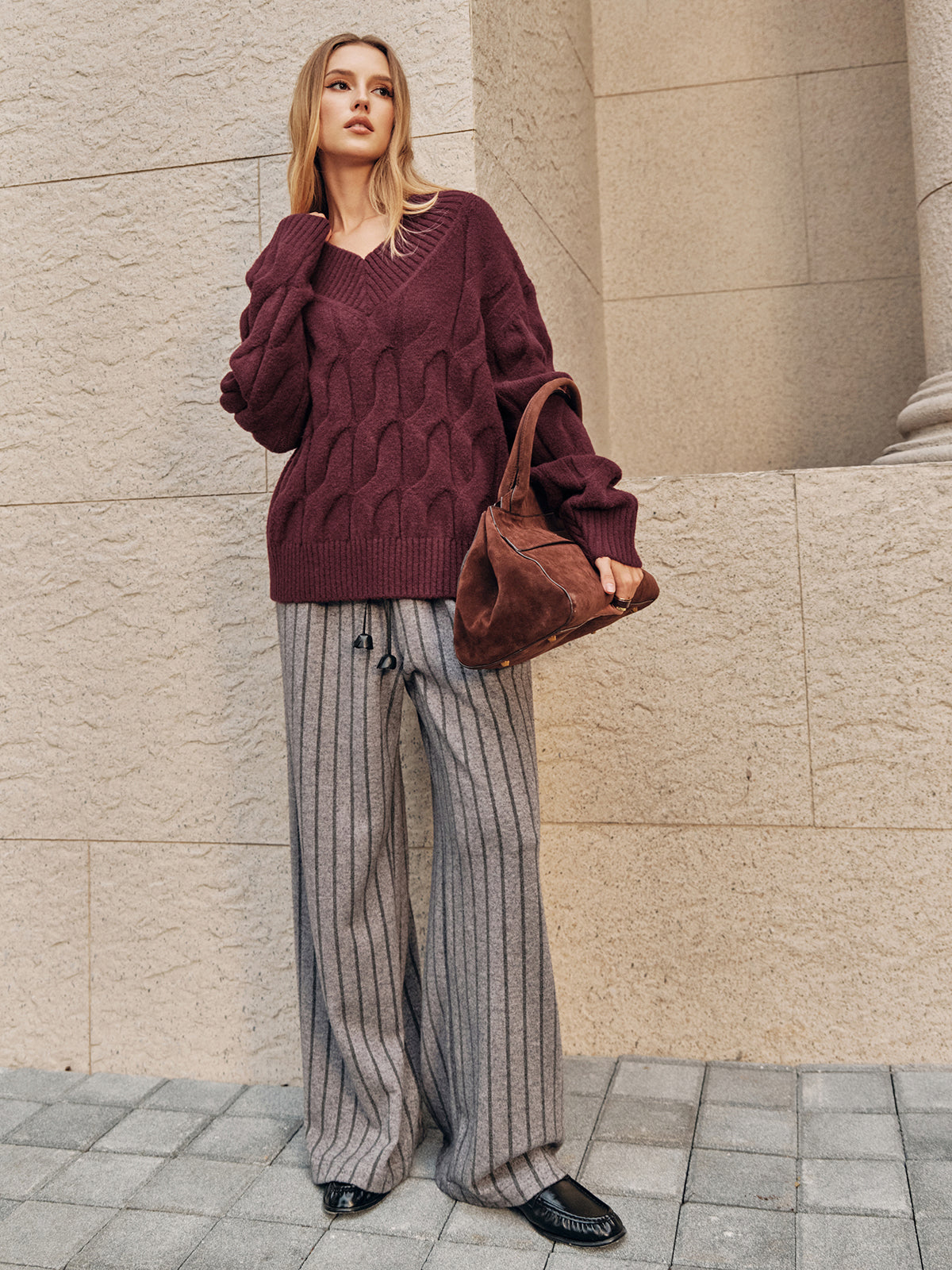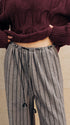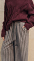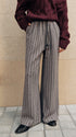 Spodnie wyróżniają się eleganckim, szerokim krojem, który zapewnia swobodę ruchów i komfort noszenia. Ich długość sięga do ziemi, co dodaje im szyku i sprawia, że doskonale sprawdzą się w formalnych stylizacjach. Pionowe paski optycznie wydłużają sylwetkę, nadając jej smukłości. W pasie zastosowano praktyczne wiązanie, które pozwala na idealne dopasowanie do talii. Spodnie te są idealnym wyborem zarówno na co dzień, jak i na bardziej oficjalne okazje. Dzięki swojej uniwersalności, stanowią świetną bazę do tworzenia różnorodnych zestawień modowych.