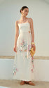 Sukienka bez rękawów z kwiatowym wzorem i wiązaniem na plecach wykonana jest z tkaniny poliestrowej o regularnej grubości. Posiada regulowane ramiączka oraz niewidoczny zamek, a jej dekolt jest niski. Krój sukienki jest dopasowany i nieelastyczny. Zaleca się pranie w temperaturze maksymalnie 30°C, unikanie wybielaczy oraz pranie z podobnymi kolorami. Prasowanie powinno odbywać się w maksymalnej temperaturze 110°C, a czyszczenie chemiczne nie jest zalecane.