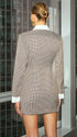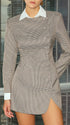 Sukienka o dopasowanym kroju to idealny wybór dla kobiet ceniących elegancję z nutą nowoczesności. Jej długość sięga przed kolano, co podkreśla zgrabną sylwetkę i dodaje lekkości całej stylizacji. Charakterystycznym elementem jest asymetryczne zapięcie na guziki, które biegnie wzdłuż przodu, nadając jej oryginalnego wyglądu. Długie rękawy zakończone mankietami oraz klasyczny kołnierzyk dodają formalnego charakteru, czyniąc ją odpowiednią na wiele okazji. Subtelne rozcięcie z przodu zapewnia swobodę ruchów, a całość prezentuje się niezwykle szykownie. To doskonały wybór na spotkania biznesowe czy wieczorne wyjścia.