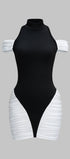 Sukienka o dopasowanym fasonie doskonale podkreśla sylwetkę, nadając jej eleganckiego charakteru. Krótka długość sięgająca przed kolano sprawia, że jest idealna na wieczorne wyjścia i specjalne okazje. Zmysłowe wycięcia na ramionach dodają nowoczesnego akcentu, jednocześnie zachowując klasyczny styl. Ciekawym detalem są marszczenia po bokach, które nie tylko urozmaicają design, ale również optycznie modelują sylwetkę. Wysoki dekolt w połączeniu z odkrytymi ramionami tworzy intrygujący kontrast, przyciągając wzrok. Ta sukienka to doskonały wybór dla kobiet ceniących połączenie klasyki z nowoczesnymi akcentami.