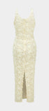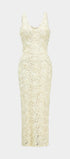 Sukienka prezentuje wyjątkowy fason, który podkreśla kobiece kształty dzięki dopasowanemu krojowi. Długość sięgająca do połowy łydki dodaje elegancji, idealnie sprawdzając się na wieczorowe wyjścia. Głęboki dekolt w kształcie litery V przyciąga uwagę i dodaje odrobiny zmysłowości. Sukienka wyróżnia się bogatą teksturą, która nadaje jej unikalnego charakteru i sprawia, że jest niepowtarzalna. Subtelne zdobienia w formie trójwymiarowych aplikacji dodają jej luksusowego wykończenia. To doskonały wybór dla kobiet, które cenią sobie elegancję połączoną z nowoczesnym stylem.