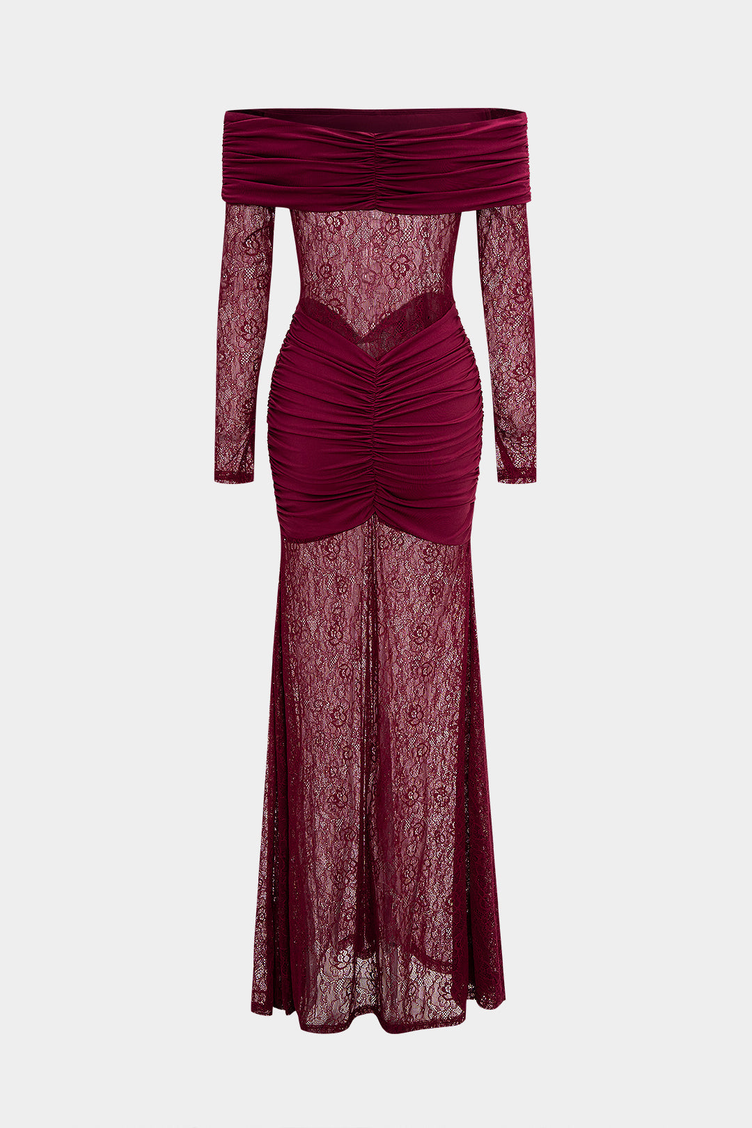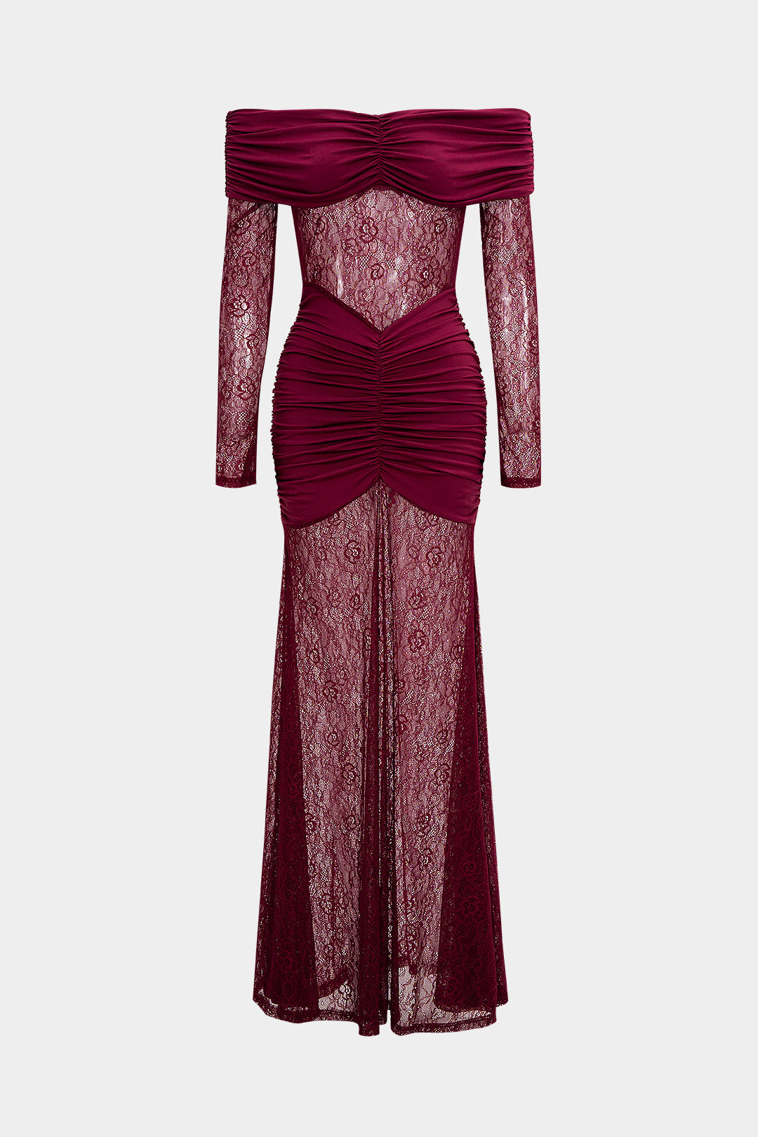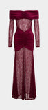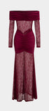 Sukienka wyróżnia się eleganckim, dopasowanym fasonem, który podkreśla kobiecą sylwetkę. Długość maxi nadaje jej wyrafinowanego charakteru, idealnego na wyjątkowe okazje. Sukienka posiada efektowne marszczenia, które dodają jej oryginalności i subtelnie modelują figurę. Przezroczysta koronka w dolnej części kreacji wprowadza zmysłowy akcent, a dekolt typu off-shoulder przyciąga uwagę, eksponując ramiona. Długie rękawy wykonane z delikatnej koronki dodają całości lekkości i elegancji. To doskonały wybór dla kobiet poszukujących stylowego połączenia klasyki i nowoczesności.